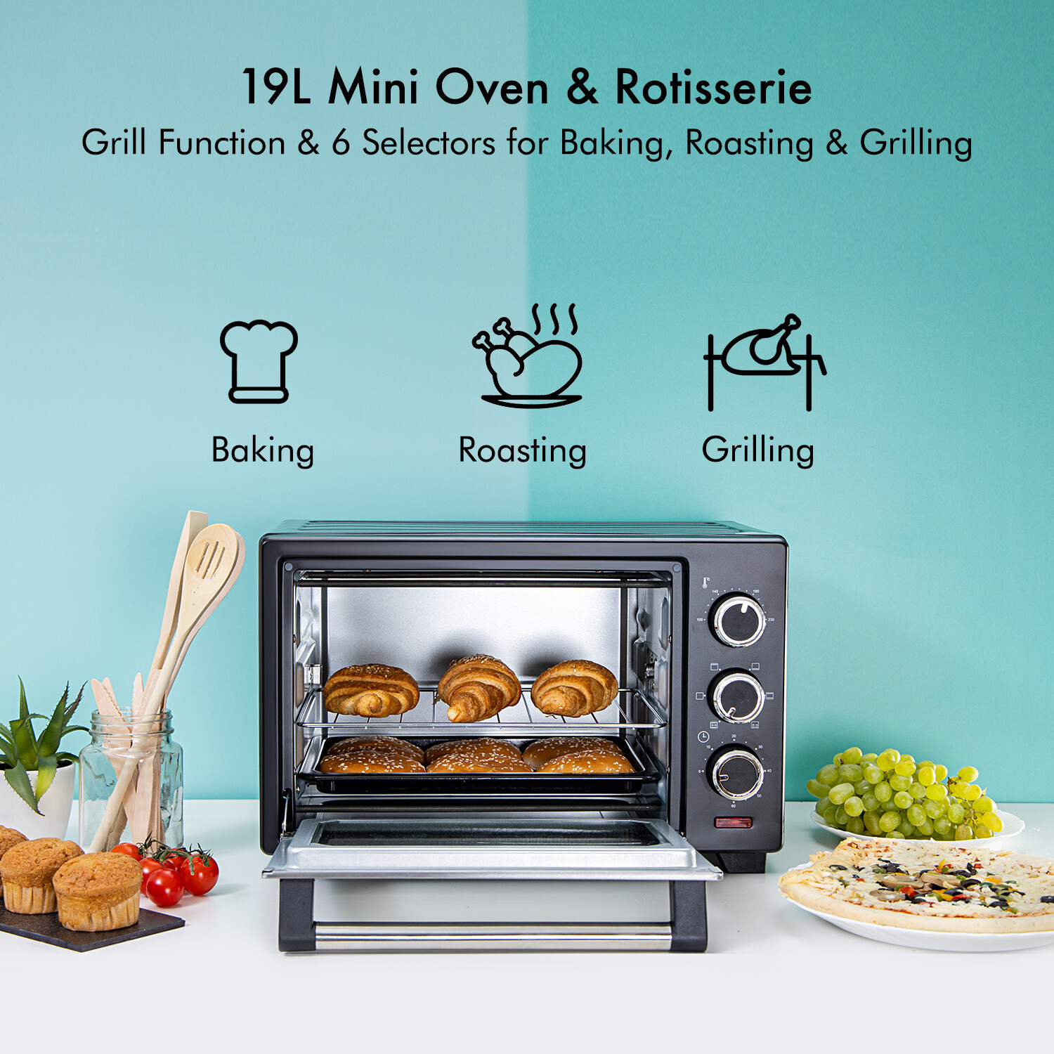 2 YEAR WARRANTY, ACCESSORIES INCLUDED - The set of electric oven includes all the accessories you need to guarantee the finest results, 1 x bake/food tray, 1 x grill bake tray/wire rack, 1 x tray handle, 1 x rotisserie fork, and 1 x rotisserie handle. All these accessories are easy to install, remove and wash.